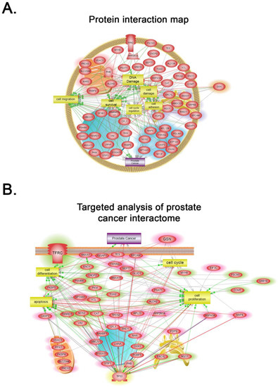 Systems biology analysis. (A) Biologically statistically significant protein interaction map showing enrichment of biological functions and pathways in PLum-AI cells that are central to cell migration, cell cycle regulation, cell damage, cell survival, DNA damage, and cell adhesion (Supporting Information Table S2). (B) Targeted analysis of prostate cancer interactome in PLum-AI cells vs. PLum-AD cells revealed dysregulation of proteins involved in cell differentiation, cell proliferation, cell cycle, and apoptosis (Supporting Information Table S3). Relationships among the differentially expressed proteins in PLum-AI cells vs. PLum-AD cells were determined using Elsevier’s Pathway Studio version 10.0 (Ariadne Genomics, Elsevier) and the Ariadne ResNet database [35,36].