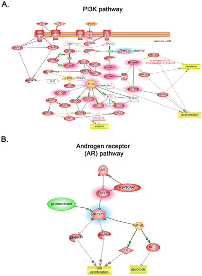 Global subnetwork analyses. Biological process gene ontology (GO) enrichment analysis of the differentially expressed proteins demonstrated enrichment of biological functions in PLum-AI cells that are central to PI3 kinase (A) and androgen receptor (B) pathways (Supporting Information Tables S4 and S5, respectively). Relationships among the differentially expressed proteins in PLum-AI cells vs. PLum-AD cells were determined using Elsevier’s Pathway Studio version 10.0 (Ariadne Genomics, Elsevier) and the Ariadne ResNet database [35,36].