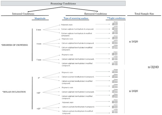 Therefore, the aim of this paper is (1) to quantify the influence of extraoral (light exposure at the scanning area (0.0, 1800, and 3600 lux), material-dependent light absorption of the scanned surface (high to low light absorption surfaces)) and (2) intraoral clinical conditions (crowding severity (2, 4, and 7 mm), magnitude of posterior tooth tipping (0°, 15°, and 30°)) on the accuracy (undetected volume (µm3) and efficiency of intraoral scanning (time, data size, and scanning failures).