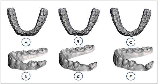 For analysis of the precision and accuracy of the scans, a modified version of the method proposed by Anh et al. (2018) was followed [19]. All the STL files of the different scans were superimposed over the original STL file with the Mecano Equate Program to determine the volume that the 3Shape TRIOS® scanner could not detect, which was defined as (d) the undetected volume. The algorithm used in the virtual superimposition was about three points: the incisal edge of the incisors, the cusp of two molars, the first right molar, and the first left molar. These three points constitute a plane that is reproducible in all STL obtained from the different scans. This method was chosen due to it allowing us to identify the amount of scanned surface and those points that have not been registered during scanning and where there could be alterations when performing a prosthesisor an orthodontic aligner since they are sensitive areas that are not fully reproduced. The undetected volume was expressed in µm [3], and it provided an estimate of the volume that the scanner did not detect in the file and was subsequently artificially recreated by the scanner software, since if some of the cast volume is not detected there may be problems with fitting because the postproduction program that fills the undetected volume is not the real surface of the volume.