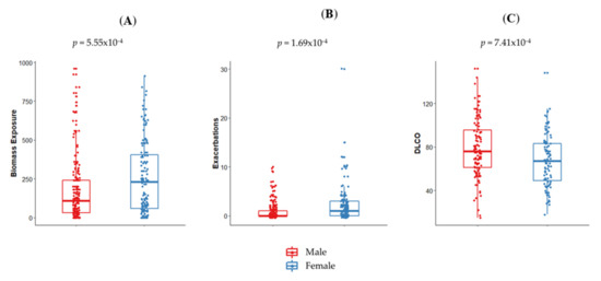 In our population, COPD patients and controls were of similar age (p = 0.69) but differed in sex proportions (p = 7.3 × 10−6), and controls showed a significantly higher average of schooling years (p = 2.2 × 10−15; Table 1). Interestingly, BMI was lower in COPD patients (p = 1.79 × 10−5), although both groups were generally overweight (Table 1). COPD patients exhibited higher amounts of cigarette smoking and cumulative exposure to biomass smoke than controls (p = 2.45 × 10−12 and p = 3.98 × 10−4, respectively). COPD patients also had reduced FEV1, FEV1/FVC, DLCO, oxygen saturation, and 6MWT compared to controls (p = 2.2 × 10−15 to p = 2.15 × 10−7). Most COPD patients were GOLD stage 2 (FEV1 between 50% and 79% of predicted). Female patients showed a higher exposure to biomass smoke and an increased number of exacerbations in the previous year (p = 5.5 × 10−4 and p = 1.69 × 10−4, respectively; Figure 1A,B). In contrast, male patients exhibited an increased DLCO (p = 7.41 × 10−4; Figure 1C).