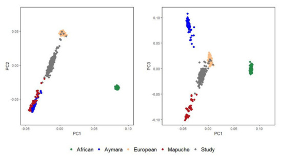 In general, Latin Americans have been considered homogenous in most genome-wide association studies (GWAS), ignoring the degree of admixture variation between Latin American countries according to the major ancestry population component. However, both Latin Americans and Hispanics/Latinos in other parts of the world are characterized by broad ethnic diversity [10], with different admixture proportions of Amerindian, European, and African ancestry between and within countries, attributed to distinct populations of origin and historic characteristics of European settlement and slave-trading [11,12,13,14]. In Chile, for example, Amerindian ancestry proportions are higher in the north and the south, whereas European ancestry proportions are highest in central regions [15,16]. Conversely, the contribution of African ancestry proportions decreases from north to south [15,16].