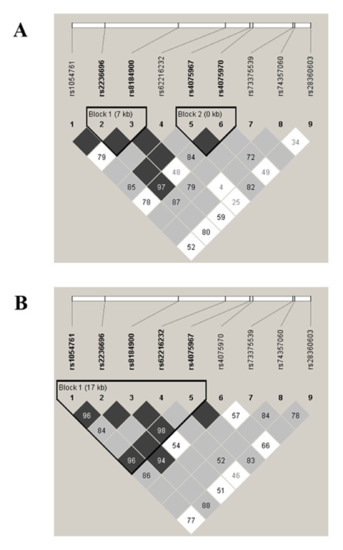 The sliding window omnibus test revealed several SNP blocks associated with COPD in the lower PMA group (Table 4). Hence, the p-values obtained for the sliding window test of a region comprising PRDM15 gene (Chr21: 43.229.099 to 43.256.172) were lower than 10−6. We also performed case–control regression analysis based on haplotype block reconstruction, and detailed haplotype block information and the LD plot around the PRDM15 gene are shown in Figure 3. In the lower PMA group, PRDM15 was divided into two LD blocks, both with two SNPs (Figure 3A), showing association with COPD (positions 43,221,826 through 43,229,099, CG (p = 7.40 × 10−6, p-value using 10,000 permutations <10−3); and positions 43,236,176 through 43,236,481, AG (p = 1.01 × 10−7, p-value using 10,000 permutations <10−4]). Differences were also found in the LD pattern among the higher PMA group (Figure 3B). No differences were observed around PRDM15 gene. When data across the four superpopulations (EUR, EAS, AMR, and AFR) were compared, high inter-ethnic differences were found in the LD patterns and haplotype blocks compared to our control population (Supplementary Figure S3).