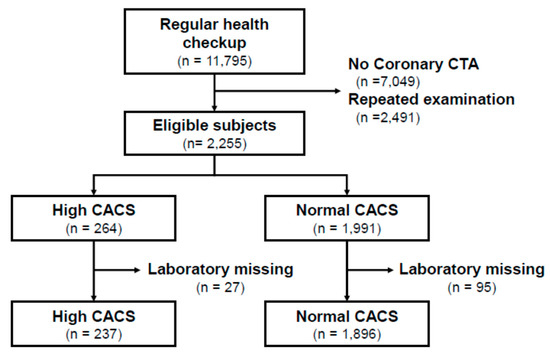 Cardiovascular disease (CVD) is one of the leading causes of death worldwide [1]. Inflammation of the vascular smooth muscle cell results in increased calcium deposits that develops into atherosclerotic plaque on the internal wall of the coronary artery. Further, the internal diameter of the vessels deteriorates due to the expansion and rupture of the calcifying plaque, resulting in cardiovascular disease [2]. When evaluating the risk of coronary atherosclerosis, we usually assess an individual’s conventional risk factors including hypertension, diabetes, dyslipidemia, and smoking. In addition, coronary artery calcium score (CACS) in computed tomography (CT) is an important predictor for future CVD development and mortality in the general population [3,4,5]. It has been reported that an assessment of CACS along with the Framingham Risk Score stratification, can be more useful in assessing future CVD development rather than just evaluating the latter [6]. Likewise, identifying CACS in the general population is a useful tool to identify high risk patients for CVD in primary prevention.