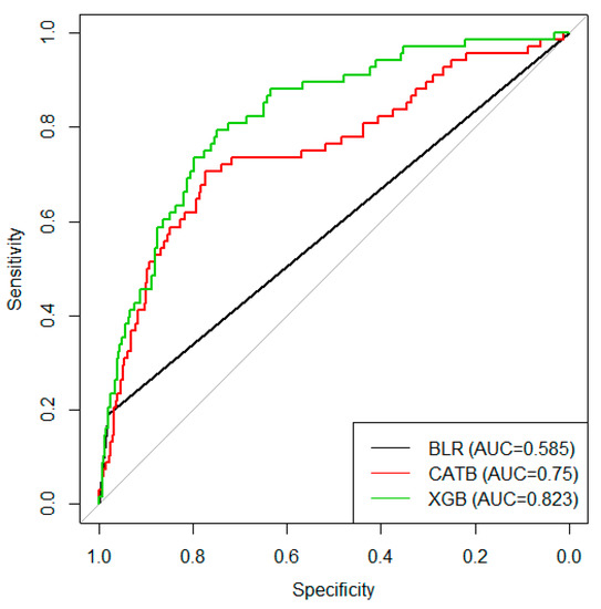 Results of the area under the receiver operating characteristic curves showing the performance of the binary logistic regression, catboost, and xgboost machine algorithms to predict high coronary artery calcium scores. BLR, binary logistic regression; CATB, catboost; XGB, xgboost; AUC, area under the receiver operating characteristic curves.