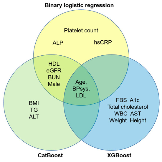 In our xgboost algorithms, male sex was not a significant predictor of CAS. Furthermore, why is the importance of input features different in predicting high CACS group for each ML model? Logistic regression is used to explain various phenomena with odds ratio but always takes into account the interaction effect when constructing the model [28]. In contrast, catboost and xgboost do not consider interaction effects because these algorithms are composed of tree-ensemble structures, which minimize the feature interaction in classification or regression tasks [15,29,30]. In addition, identifying the importance of catboost and xgboost features could give us novel feature information for CACS prediction. In our result, alkaline phosphatase, platelet count, estimated glomerular filtration rate, body mass index, and white blood cells were importance features in ML algorithms. Alkaline phosphatase is already one of the risk factors or treatment target for cardiovascular disease in addition to the highly sensitive C-reactive protein as atherosclerotic biomarkers [31]. Likewise, implementation of ML other than logistic regression could be useful to improve prediction performance and to find novel associations between input features and target disease.