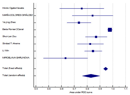 The performance of miRNA-150 as a diagnostic biomarker was assessed using AUC. Our meta-analysis included eight relevant studies [21,27,28,29,30,31,32,33]. The estimated AUC ranged from 0.632 to 0.978 (Figure 2). Five studies [21,27,30,31,32] investigated miRNA in serum, two [28,33] in plasma, and one [29] in peritoneal lavage. The p-values according to the analysis were less than 0.001, meaning that they demonstrated a significant diagnostic value of miR-150. Therefore, we used the random-effects model and found an AUC of 0.830, 95% CI [0.761–0.898] (Figure 3). Pooled analysis was heterogeneous (I2 = 89%).