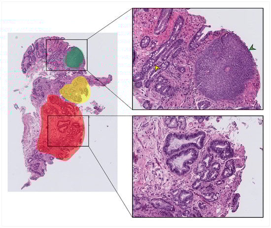 An example of the annotation process on a typical whole-slide image (WSI). Red, green, and yellow highlighted areas indicate areas that were annotated and from which labeled patches were taken. Squamous tissue (green arrowhead), non-dysplastic Barrett’s with Goblet cells (yellow arrowhead), and dysplastic tissue with crowding and hyperchromasia (lower zoomed section) were all present within the same whole-slide image.