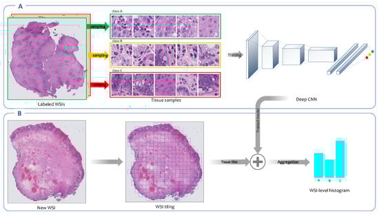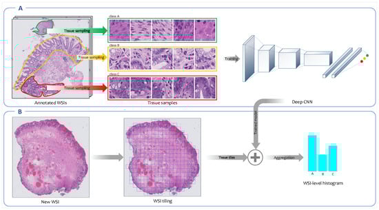 Overview of the fully supervised feature extraction framework. (A) A convolutional neural network (CNN) is trained on high-resolution tissue tiles sampled from annotated regions of WSIs in the training set. (B) Next, the trained model is employed to output the class’ probability distributions for each high-resolution tissue tile generated from new WSIs. The patch-level probabilities corresponding to all patches derived from a WSI are aggregated into WSI-level probabilities histogram.