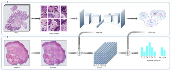 As a result of using the histogram-based method, each image is represented as a histogram; the mapping mechanism and histogram structure depend on the feature extraction approach (i.e., fully supervised, weakly supervised, or unsupervised). To extract histological features from tissue tiles, each WSI is considered as a set of tissue tiles . This method uses a function to map each image tile x belonging to WSI to a concept . In practice, instead of , its representation learned by neural network with parameter is considered, in which . All concepts can be organized in as a vocabulary . Consequently, WSI is mapped to histogram as follows []: