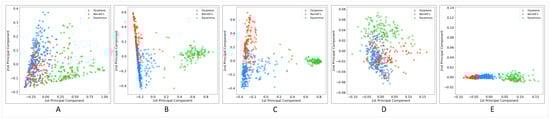 Principle component analysis (PCA) plot for WSIs encoded using (A) fully supervised, (B) multiple instance learning (MIL), (C) expectation-maximization (EM), (D) unsupervised (k-means), and (E) unsupervised (GMM) approaches.
