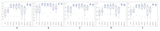 Boxplots of the 10-fold cross-validation results for weighted (A) accuracy, (B) area under the ROC curve (AUC), (C) precision, (D) recall, and (E) F1 score in different models.