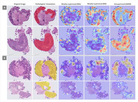 For more scrutiny about the models’ performances, heatmaps using different feature extraction approaches on WSIs with dysplastic BE and non-dysplastic BE were considered. In this evaluation, the performances of weakly supervised (MIL and EM) and unsupervised (GMM) approaches, which have better performances in the classification of WSIs, were examined. Some heatmaps for WSIs from both classes generated by the three approaches mentioned above are presented in Figure 7. In each heatmap, image regions that are more important given the associated classes are in red. As can be seen, the performance of the unsupervised approach in ROI detection is far better than the performances of the weakly supervised approaches.