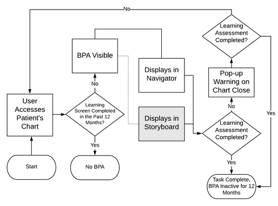 The BPA selected for this study is the learning screen, which triggers in an outpatient encounter when the patient has not had a learning screen in the past 12 months, and therefore has raised concerns about alert fatigue due to a high volume of firings in recent years. The BPA directs nursing staff (via a hyperlink) to an education activity with five questions that assess learning preferences, addressed to either the patient or their caregiver. In the pre-redesign state, this BPA was found only in the “navigator” screen, an area voluntarily accessed by the user to complete passive BPAs. However, if not completed by the time the user closes the chart, the BPA will fire as a pop-up reminder. The redesign of this BPA using Storyboard included the same functionality, but with the addition of a persistent yellow banner at the upper left of the chart. Figure 2 represents the functionality of the BPA pre- and post-redesign; the grey box indicates the Storyboard format that was added.