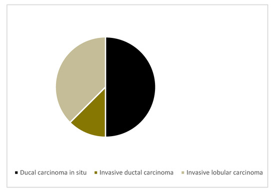 Out of the 10 MRI indeterminate lesions, eight were biopsy-proven malignant (ductal carcinoma in situ (n = 4), invasive ductal carcinoma (n = 1) and invasive lobular carcinoma (n = 3)). The remaining lesions were benign fibroadenomas (n = 2) (see Figure 2 and Table 2).
