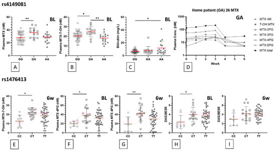 | MTX (BL) | nM | 28.0 | 7.5 | 35.8 | 7.8 | 28.9 | 8.2 | 0.011 | GG vs. GA | 0.010 | ** | |