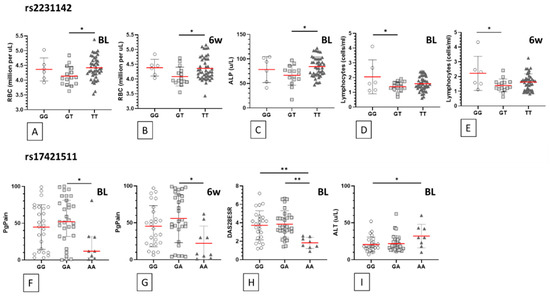 | ALT (BL) | u/L | 20.6 | 10.1 | 21.8 | 11.1 | 32.0 | 15.9 | 0.047 | GG vs. AA | 0.048 | * | |