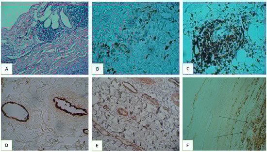 Inflammatory infiltrates and vasa vasorum in the aortic aneurysm wall, ICH staining. ICH—Immunohistochemistry (A) lymphoid infiltration of adventitial vasa vasorum. Hematoxylin and Eosin stain, magnification ×100; (B) CD4+ T cells in the area of the newly formed vasa vasorum, magnification ×200; (C) adherent CD8+ T-cells on the vasa vasorum endothelium (indicated by a long arrow), magnification ×200; (D) von Willebrand factor antibodies for detection vasa vasorum endothelium, magnification ×100; (E) vasa vasorum smooth muscle α-actin, magnification ×200; (F) Lp(a) accumulations in a fibrous plaque (indicated by a long arrow), magnification ×200.