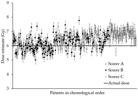 Graph showing the dose estimate and standard errors for each person. The data are presented in chronological order, (samples received over a continuous 18 month period) and for each scorer who analysed the sample. Every sample was given an ex vivo X-ray dose of 6 Gy.