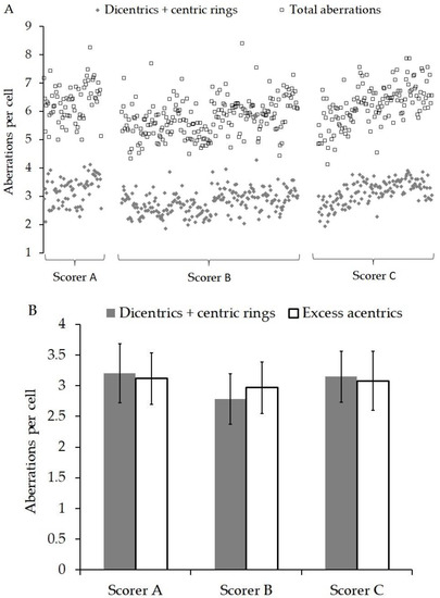 (A) Shows the yield of total aberrations (dicentrics + centric rings + excess acentrics) and dicentrics + centric rings found in each patient and grouped by scorer A, B or C. Within each group, the patients are arranged in chronological order. (B) shows the average yield of dicentrics + centric rings and excess acentrics analysed by scorers A, B and C. The errors bars represent the standard deviation.