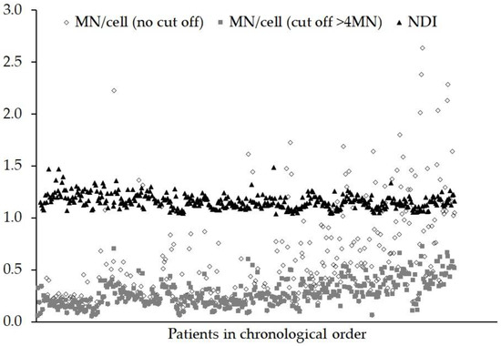 For normal unexposed lymphocytes, the expected NDI values tend to be in the range from 1.30 to 2.20 [38]. Here, as shown in Figure 3, the range of NDI values was 1.05 to 1.50. These lower values probably reflect the fact that cells were delayed in their cell cycle after exposure to a 2 Gy genotoxic insult and that only the automated score of mono- and bi-nucleate cells were used to calculate the NDI. Figure 3 also shows that the range of values for the MN/cell (no cut off) is much wider than the MN/cell (cut off >4 MN), 0.06–2.64 and 0.06–0.73, respectively, especially towards the latter part of the study. Previous work [25], suggests that many of the objects in BN cells automatically classified as containing more than four MN tend to be artefacts or debris. In addition, the cross-correlation analysis showed no correlation with NDI for MN (cut off >4 MN), suggesting that when using automated scoring, cut off could be important.