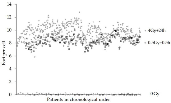 Figure 4 shows the foci yields for each patient in chronological order for the 0 Gy, 0.5 Gy + 0.5 h and the 4 Gy + 24 h samples. ANOVA revealed that the effect of the scorer was not significant for the actual number of foci/cell (4 Gy + 24 h), p = 0.789, but only one batch of eight samples was scored by another person. In addition, the sampling time of day was not significant for 0.5 Gy + 0.5 h (p = 0.455) or 4 Gy + 24 h (p = 0.241). The effect of the person staining the samples was shown to be significant (p < 0.001), although all samples were stained by one person except for one batch of eight 0.5 Gy + 0.5 h samples. As with the DCA and MNA, the date of the blood sampling was significant (p = 0.001) for the FCA.