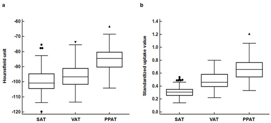 Distribution of computed tomography-attenuation (Hounsfield unit) (a) and standardized uptake value (b) for subcutaneous adipose tissue (SAT), visceral adipose tissue (VAT) and periprostatic adipose tissue (PPAT). (Central box, the values from the 25 percentile to 75 percentile; middle line in the box, median value; error bar, extending from the minimum value to the maximum value except outside values; circle, an outside value for SAT parameters which is smaller than 25 percentile minus 1.5 times the interquartile range or larger than the 75 percentile value plus 1.5 times the interquartile range; inverted triangle, an outside value for VAT parameters which is larger than the 75 percentile value plus 1.5 tines the interquartile range; positive triangle, an outside value for PPAT parameters which is larger than the 75 percentile value plus 1.5 times the interquartile range)
