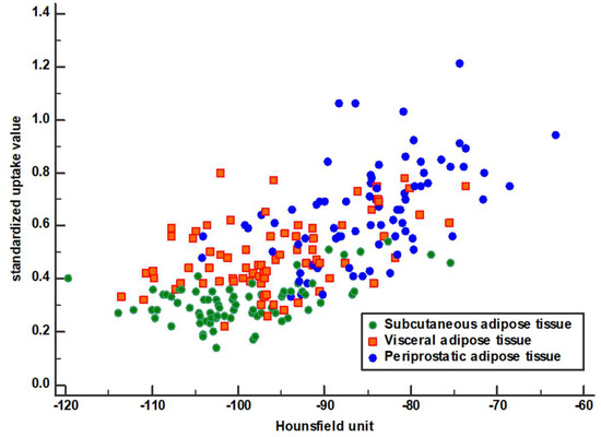 A scatter plot showing the relationship between CT-attenuation and standardized uptake value in subcutaneous, visceral, and periprostatic adipose tissue.