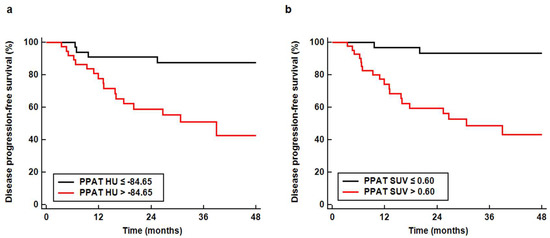 Disease progression-free survival curves according to the computed tomography-attenuation of periprostatic adipose tissue (PPAT HU) (a) and standardized uptake value of periprostatic adipose tissue (PPAT SUV) (b).