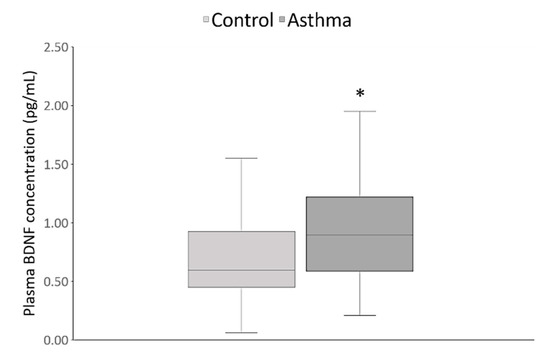 Our finding that asthma patients had significantly higher concentrations of plasma BDNF than healthy individuals is in contrast to earlier studies that reported no differences in the serum and sputum BDNF levels between healthy subjects and patients with asthma [23,24]. Nevertheless, our data are in line with the report on increased BDNF levels in the serum, platelets, and plasma of asthma patients compared to the control group [21,59]. It has also been shown that children with moderate and severe asthma had higher plasma BDNF levels than age-matched control subjects [22]. Moreover, the study of Freeman et al. (2017) demonstrated higher BDNF expression and secretion in airway smooth muscle of asthma patients compared to patients without asthma [60].