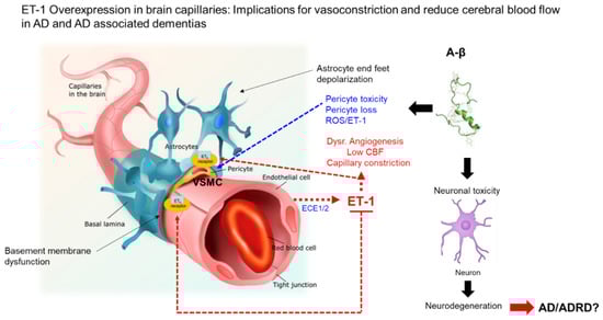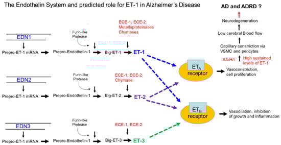 Alzheimer’s disease (AD) and related dementias (ADRD) disproportionately impact racial and ethnic minority and socioeconomically disadvantaged adults [,,,,]. Racial and ethnic disparities in AD could be explained by differences in vascular disease pathology. Upregulation of the endothelin system is present in African Americans (AAs) when compared with non-Hispanic Whites (NHWs) []. Endothelin-1 (ET-1) is a potent vasoconstrictive peptide that is released basolaterally primarily by endothelial cells to induce vascular smooth muscle cells and pericyte contractions [,,]. Pericytes expressed BQ-123-sensitive ETA receptors for endothelins, as evidenced by 125I-Et-1 binding experiments []. Dysregulation of the endothelin system occurs in AD. However, AAs experience higher vasoconstriction-mediated blood pressure in response to acute stress than NHWs. A study by Treiber et al. that examined hemodynamic and plasma ET-1 levels in AA and NHW males revealed that AAs had higher resting plasma ET-1 levels and a greater increase in ET-1 in response to stressors []. The data supports the notion that racial differences exist in hemodynamic reactivity to stress between AAs and NHWs []. AA adults with hypertension have been shown to have significantly higher ET-1 levels than normotensive AAs and NHWs []. Ergul et al. discovered that AAs have a higher ratio of vasoconstriction-promoting ET receptors in saphenous veins when compared with NHWs, regardless of whether they were hypertensive, which implicates racial differences in peripheral vascular resistance and diminished vasodilatation in response to environmental stress []. These findings suggest that AAs are at higher risk for cardiovascular disease than NHWs, which also increases their risk of dementia. Diabetes mellitus (DM) is associated with an increased risk of cognitive decline and AD later in life. Studies have shown that type 2 DM (T2DM) nearly doubles the risk of AD, and it is well known that a health disparity exists among AAs for T2DM when compared with NHWs []. Signal peptide-CUB-EGF-like-containing protein 2 (SCUBE2) has been shown to be upregulated in atherosclerotic human coronary artery disease []. Ali et al. examined SCUBE2 expression in T2DM patients with dyslipidemia and found that upregulation of SCUBE2 expression in dyslipidemic T2DM is associated with higher levels of ET-1 when compared with controls []. Kostov et al. examined serum concentrations of ET-1 and matrix metalloproteinases-2, -9 in pre-hypertensive and hypertensive patients with T2DM []. They demonstrated increased levels of ET-1 in patients with T2DM when compared with controls, suggesting that high levels of ET-1 could lead to long-lasting increases in blood pressure and clinical manifestation of hypertension []. Palmer et al. revealed that ET-1 levels are elevated in AD and are upregulated by amyloid β (Aβ); they also demonstrated that endothelin-converting enzyme-2 (ECE-2) is upregulated by Aβ, and its expression is elevated in AD post-mortem brain tissue when compared with controls []. Furthermore, ET-1 expression is induced by hypoxia or ischemia caused by pericyte-mediated constriction of brain vascular capillaries []. Here, I examine the role of the ET-1 system in the development of neuronal injury that contributes to the pathology of AD and possible ADRDs.