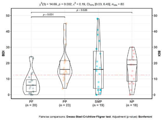 Depressive symptoms in CP. PF: pain-free participants. PP: primary CP participants, SMP: secondary musculoskeletal CP participants, NP: neuropathic CP participants. Mean values: PF µ = 7.5, CI95% (4.29, 10.71), PP µ = 18.83, CI95% (14.31, 23.35), SMP µ = 17.84, CI95% (10.77, 24.91), NP µ = 16.11, CI95% (11.73, 20.49). Red dotted line indicates clinical cut off for depressive symptoms, scores above 14 differentiate mild, moderate and severe depressive states [65,66]).