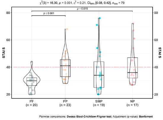 There was a statistically significant difference (Figure 4) between groups [χ2(3) = 16.30, p < 0.001]. Primary pain [M = 41.04; SD = 9.52; p <= 0.001] and neuropathic pain participants [M = 41.82; SD = 14.18; p = 0.02] had significantly higher state anxiety compared to pain-free participants [M = 29.45; SD = 5.88]. Once again, secondary musculoskeletal pain participants were the exception [M = 37.95; SD = 15.92; p = 0.25] reporting subclinical anxiety levels that were not significantly different from pain-free participants. There were no significant differences in state anxiety between CP subtypes.