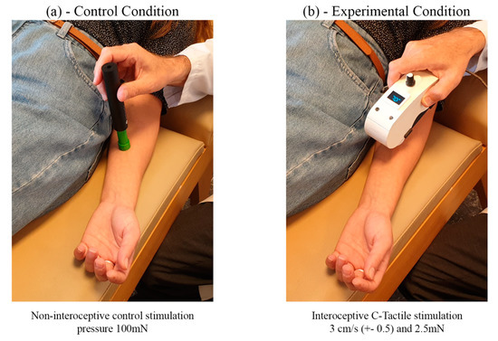 Therefore, following the procedure in Di Lernia, Serino [67] and Di Lernia, Cipresso [41], experimental and control conditions used these two essentially different forms of tactile stimulation. For the experimental condition this was interoceptive CT stimulation on the left volar forearm [24], provided by a specially developed instrument [41] (Figure 5b) that delivers a pattern of circular stimulation at 3 cm/s and 2.5 mN with a linear component of 0.5 cm/s, moving from elbow to wrist and back. This body site was chosen following microneurographic evidence in the literature confirming the presence of CT afferents in the volar forearm of healthy participants [79]. In the control condition in Study 2, participants received non-interoceptive stimulation applied to the same site with similar time parameters, moving from elbow to wrist and back along the left volar forearm in the same fashion as in the experimental condition. This non-painful, non-interoceptive pressure stimulation was delivered using a pre-calibrated cylinder with smooth edges (Figure 5a). Pressure was pre-determined by the weight of the cylinder on the skin (100 mN) following literature recommendations [32,78,80]. As described above, this provides an optimal control condition because, crucially, non-painful pressure stimuli are not processed by the interoceptive C-Tactile afferent system [32,78] In both conditions, tactile stimulation was delivered for 6 blocks, each comprising 6 short periods of stimulation of 8 s, 10 s, 12 s, 14 s, 16 s, and 18 s, presented in random order, with pauses of 6 s after every period of stimulation. The entire duration of the stimulation, in each condition, was approximately 11 min. Pain measures were collected immediately before and after the stimulation, with a Numeric Rating Scale (PainNRS) ranging from 0 (no pain) to 10 (the worst pain imaginable).