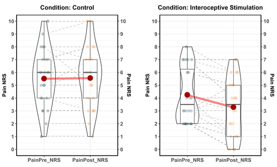 Results of the LMMs indicated that there was a significant reduction in perceived pain following the interoceptive stimulation. The total explanatory power of the first Linear Mixed Model was substantial (conditional R2 = 0.90). The part related to the fixed effects alone (marginal R2) was 0.15. The model’s intercept, corresponding to Pain = 0, Time = PainPre_NRS, Condition = Control and ID = 1, was at 5.52 (SE = 0.45, 95% CI [4.64, 6.40], std. intercept = 0.35, p < 0.001). Analysis of variance (ANOVA) on this Linear Mixed Model’s parameters indicated a significant main effect of Time [F (1, 47) = 8.6796, p = 0.005, ηp2 = 0.148, Cohen’s f = 0.417] and a significant main effect of Condition [F (1, 47) = 8.1159, p = 0.006, ηp2 = 0.140, Cohen’s f = 0.403]. More importantly, the interaction effect of Time × Condition was significant [F (1,47) = 10.2577, p = 0.002, ηp2 = 0.170, Cohen’s f = 0.453]. Post hoc analyses indicated that the Experimental group who received the interoceptive stimulation reported a significant reduction of pain [EMM estimate = −0.958, SE 0.223, pb < 0.001] between pain before the stimulation [PainPre_NRS EMM = 4.25, SE = 0.457] and pain after the stimulation [PainPost_NRS EMM = 3.29, SE = 0.457]. No significant differences in perceived pain were found in the Control group following the stimulation [EMM estimate = 0.040, SE = 0.218, pb > 0.05]. Moreover, no significant differences were found in pain at baseline between the Control and Experimental groups [EMM estimate = 1.270, SE = 0.640, pb = 0.315].