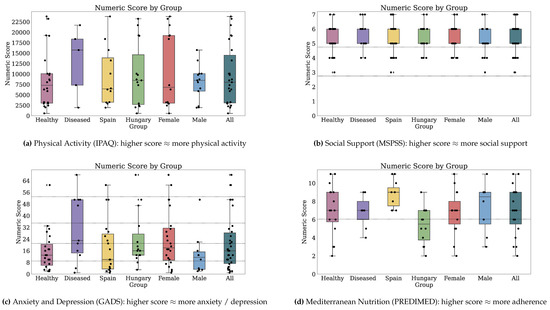 Numeric scores for Physical Activity, Social Support, Anxiety and Depression, and Mediterranean Nutrition. Dotted markings delimit levels of the categorical score, where available (1 of 2).