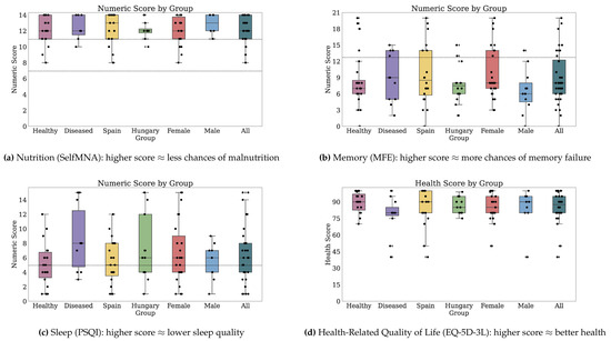Forty-two seniors (mean age 69.8 ± 7.4) signed up for the study. From these, 39 participants (mean age 70.0 ± 7.2, 22 women, 26 from Spain 26 and 13 from Hungary) provided at least one PRO; three participants were disqualified. Out of the qualified participants, 28 reported no health condition (thus being in the healthy health group) and 11 reported a mild health condition (forming the diseased health group). Participant characteristics are available in Table 4.