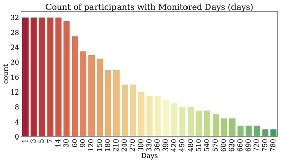 Thirty-two participants provided both PROs and TechROs. Figure 4 and Figure 5 depict the counts of participants by monitored and valid Fitbit days, respectively. Figure 6 and Figure 7 depict the distribution of monitored and valid Fitbit days, respectively. Figure 8 and Figure 9 depict the medians of TechROs across the entire monitoring period for the participants. Appendix B.2 provides additional details on compliance and analyses each TechRO in-depth.