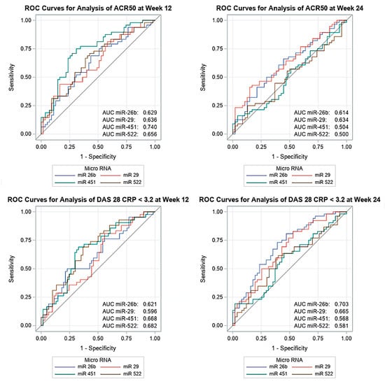 To evaluate potential correlations between miRNAs expression and olokizumab therapy efficiency, the baseline expression of each miRNA was compared in groups of responders and non-responders. MiRNAs demonstrated significant differences were subjected to further analysis and the receiver operating characteristic (ROC) curves were generated for each of them. Statistically significant results were obtained for the following associations: miR-29 and ACR20 response at week 12 and 24, ACR50 at week 12 and 24, and DAS28-CRP response at week 24; miR-451 and ACR20 response at week 12, ACR50 at week 12, DAS28-CRP response at week 12; miR-26b and ACR50 response at weeks 12 and 24, DAS28-CRP response at weeks 12 and 24; miR-522 and ACR50 response at week 12, DAS28-CRP response at week 12 (Figure 1; Supplementary Table S1).