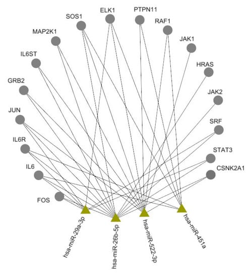 As miRNAs exert their functions by targeting mRNAs and negatively regulating translation, their effect depends on target’s functions []. The capability to target numerous effectors of important signaling pathways has made numerous miRNAs one of crucial genome regulators. As olokizumab acts as inhibitor of IL-6/IL-6R, we proposed that prognostic potential of these miRNAs in olokizumab treatment could be in part associated with their effect on the signaling pathway.