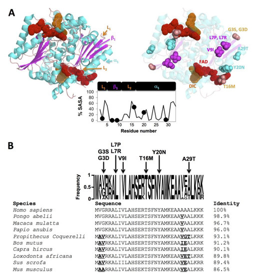 Structural location and sequence conservation of the NQO1 mutations studied in this work. (A) Structural representation on the dimeric structure of NQO1 (PDB code 2F1O; [72]). The left panel shows the secondary structure elements to which mutated residues belong (L1, residues 1–4; β1, residues 5–10; L2, residues 11–16 and α1, residues 17–33). The right panel shows the location of the mutated residues as well as the FAD and dicoumarol (Dic) molecules. Residues are colored according to the secondary structure. The plot in the middle shows the solvent accessibility (% SASA) of this region (determined using GETAREA on the PDB code 2F1O as the average of the two monomers in the dimer). (B) Sequence alignment of 10 selected NQO1 mammalian proteins. Residues in bold-underlined indicate non-conservative mutations vs. the human sequence (note that K-to-R or V-to-I are considered as conservative). The frequency plot over the NQO1 alignment (generated using WebLogo, https://weblogo.berkeley.edu/) also shows the identity of the missense mutations investigated in this work.