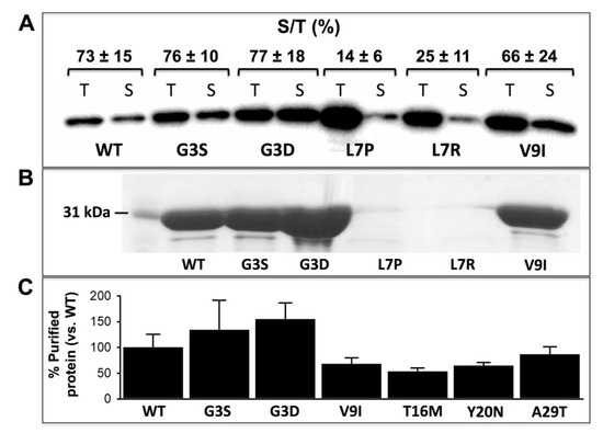ESs were meant to provide a semiquantitative ranking of pathogeniticy: an ES of 1 corresponded to a severe mutation, ES of 2 to a mild one and ES of 3 to a neutral mutation. Calculation of the ESs for this set of mutants showed that five mutations caused large defects on protein stability and/or solubility, and thus, these were considered as severe (i.e., ES of 1), including the mutations L7P and L7R (Table 2). The remaining 17 mutations showed an ES ranging from 1.4–3.0. Among the lowest ESs, we found the polymorphism P187S, the gold standard of loss-of-function in NQO1 [41,43,52,68]. Most of the mutations in the Nt and K240 sets showed mild to neutral ESs (ES from 2.2 to 3), whereas variants in the P187 set were more deleterious (ES from 1 to 2).
