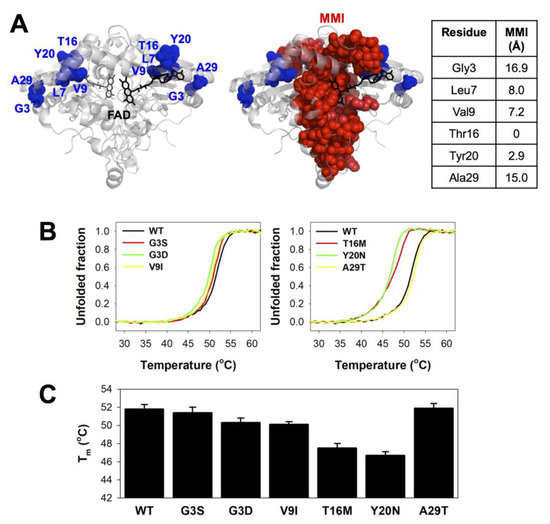 For the six mutants amenable for purification, we analyzed and compared their stability with that of the WT protein in the presence of an excess of FAD (NQO1holo) and using fluorescence-monitored thermal denaturation (Figure 3). To some extent, the thermal stability of NQO1 variants allows to capture the perturbation caused by the mutations on the MMI since the dimer dissociates prior to the rate-limiting step of the irreversible denaturation [15,39,41]. T16 and Y20 are within or in very close proximity to the MMI and mutations at these residues are potentially the most damaging for dimer stability (Figure 3A). Consequently, the mutations T16M and Y20N, which may introduce mild to moderate structural perturbations (Table 1), led to significant changes in thermal stability (i.e., their Tm were lower than that of the WT protein by 4–5 °C) (Figure 3B,C). L7 and V9 are at the shortest distance of 8 Å from the MMI (Figure 3A). Accordingly, the severely perturbing L7P and L7R mutation may significantly destabilize the MMI, thus explaining the dramatic effects of these mutations that prevent dimer formation or severely affect its stability (Figure 2). The mild effects of the mutation V9I likely reflect a small structural perturbation in some proximity to the MMI (reducing thermal stability by 1.5 °C; Figure 3B,C). G3 and A29 are over 15 Å away from the MMI (Figure 3A), and consequently, the effects of the mutations G3S, G3D and A29T in thermal stability were marginal (Figure 3B,C).
