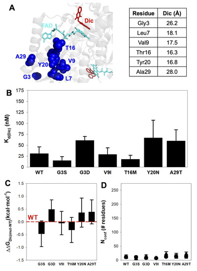 3.5. None of the Mutations Affect Dic Binding Affinity or Energetics