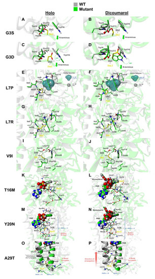 Overview of the mutational effects from in silico mutagenesis. Gray-colored amino acids represent the WT structure while green-colored amino acids represent the mutated models. Mutated residues are shown as sticks colored in yellow for each case. (A,B) NQO1holo (A) and NQO1dic (B) states with the G3S mutation. Green arrows indicate displacement of the N-terminus on the opposite side of the mutation. (C,D) NQO1holo (C) and NQO1dic (D) states with the G3D mutation. Green dashed arrows indicate side chain rotation. (E,F) NQO1holo (E) and NQO1dic (F) with the L7P mutation. Blue and gray surfaces represent cavities in the protein core for the mutant and WT, respectively. (G,H) NQO1holo (G) and NQO1dic (H) with the L7R mutation. Clashes are shown as blue solid lines marked with inter-atomic distances. (I,J) NQO1holo (I) and NQO1dic (J) with the V9I mutation. Hydrophobic interactions are shown as solid lines between interacting atoms colored gray and blue for the interactions created by V9 (WT) and I9 (V9I mutant) residues, respectively. (K,L) NQO1holo (K) and NQO1dic (L) with the T16M mutation. Ligand atoms are displayed in ball representation. Hydrogen bonds are depicted as yellow dashed cylinders. (M,N) NQO1holo (M) and NQO1dic (N) with the Y20N mutation. (O,P) NQO1holo (O) and NQO1dic (P) with the A29T mutation. Helices α1 and α9 are shown in ribbon representation.
