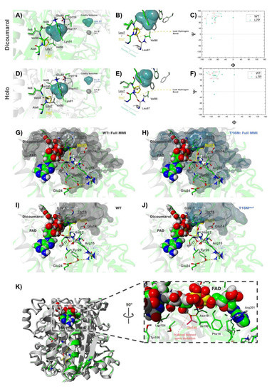 Detailed structural analysis of the mutations L7P (A–F), T16M (G–J) and A29T (K). (A) Overall view of the L7P site in the NQO1dic state (mutated residue in yellow). The mutation generates a cavity in the hydrophobic core of the protein (semi-transparent blue for L7P and gray for WT protein). (B) Close-up view on the hydrogen bond disrupted by L7P in the NQO1dic state. (C) Ramachandran plot of the first ten amino acids in the NQO1dic state. Arrows indicate the displacement in dihedral angles caused by L7P mutation that affects the β-sheet pattern near the mutated site. (D) Close-up of the mutated site (in yellow) in the NQO1holo state. The mutation L7P generates a cavity in the hydrophobic core of the protein represented in semi-transparent blue (L7P) and gray (WT). (E) Zoom-in on the hydrogen bond formerly established by L7 and disrupted by the L7P mutation in NQO1holo. (F) Ramachandran plot of the first ten amino acids in NQO1holo showing, with arrows, the displacement caused by L7P mutation that affects the β-sheet pattern near the mutated site. (G–J) Effects of the T16M mutation on the MMI of the NQO1dic state. The MMI surface is shown in gray for the WT and in bluish for the T16M mutant. The overall view is similar to that shown in Figure 7L. The complete MMI for the WT protein (G) vs. T16M mutant (H) is shown. Mutational effects are found in the top right corner. (I,J) Similar representations to those in panels (G,H) but only showing residues of the MMI close (<5 Å) to the mutated site. (K) Close-up view of the hydrogen bond formed between FAD and residue T148 in the A29T mutant in the NQO1dic state.