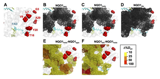 Location of mutated residues regarding local stability measurements by hydrogen/deuterium exchange (HDX). (A) Structural location of mutated residues regarding bound FAD and Dic. (B–D) Residues in dark grey/dot representation indicate those regions of the WT protein (NQO1apo, NQO1holo and NQO1dic) that are highly stable (<20% HDX after 3 h). (E,F) Residues in dot representation (see color scale) indicate those whose stability (as Δ%Dav) was increased between the two states (NQO1holo vs. NQO1apo and NQO1dic vs. NQO1holo). Plots are generated using primary data from [90].