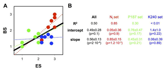 Correlation between experimental scores (ESs) and bioinformatic scores (BSs). (A) Plot of ES vs. BS for all mutants compiled in Table 3 and Table 4. Red circles show mutants belonging to the Nt set (the eight mutants characterized in this work) and green and blue circles show mutants belonging to mutations at the P187 and K240 sites, respectively (P187 and K240 sets, see Table 3 and Table 4 [39]). The thick black line is the linear regression of all mutants, while dotted lines are linear fittings using one of the three sets (Nt, P187 or K240 sets; red, green and blue lines, respectively). (B) Best-fit parameters for linear regressions are shown in panel B.