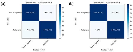 The performance metrics of CNN models are presented in Table 2. The mean AUC for breast cancer detection in mammograms was 0.952 ± 0.005 by DenseNet-169 and 0.954 ± 0.020 by EfficientNet-B5. The mean accuracy was 88.1 ± 0.2% by DenseNet-169 and 87.9 ± 4.7 by EfficientNet-B5. For the DenseNet-169 model, mean sensitivity and specificity values were 87.0 ± 0.0 and 88.4 ± 0.2, respectively. The normalized confusion matrix for each CNN structure differentiating malignant images from non-malignant ones is presented in Figure 2.