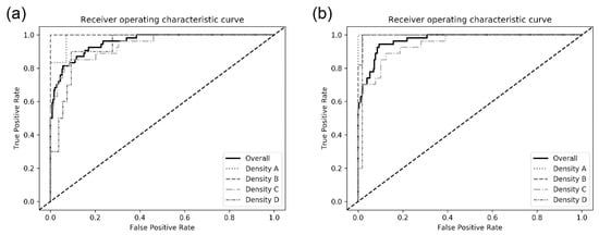 The majority of cancer cases that were initially undetected in screening mammograms correlate with dense breast tissue (density equal to C or D) [40]. Large numbers of breast lesions are occluded by overlapping fibroglandular tissues in two-dimensional images. Our results showed high performance even in patients with a dense breast tissue, grade C or D, although there a higher performance was seen in patients with grade A or B. Researchers already reported the lower detection rates in dense breast, where masking could occur [29,39,40]. Our models can assist radiologists in mammogram interpretation resulting in higher accuracy and detection rates. Assisting and improving human performance in the medical field is one of the roles anticipated to be undertaken by artificial intelligence.